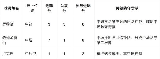 罗穆洛的“串联+终结”(进攻中枢)、鲍姆加特纳的“后插上高效终结”(中场火力)、卢卡巴的“全勤防守稳定”(后防基石),三者数据形成互补:卢卡巴稳固后防,鲍姆加特纳、罗穆洛回防衔接,形成“后防-中场-前场”的层层拦截。这套数据支撑的“铁三角”,正是莱比锡从“首轮溃败”到“7场6胜1平”的核心战术保障。
