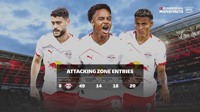 通过分析AWS提供的德甲比赛数据,我们了解了RB莱比锡在第八轮表现中的"进攻区域"分布和"预期进球"效率。("进攻区域"含义为球队攻入了对方的三十米区域,这是通过将该区域划分为四个大小相等的垂直区域来实现的。)