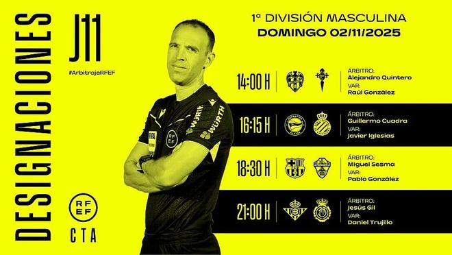 11月1日,西班牙足协官方公布了周日西甲4场比赛的裁判安排,米格尔-塞斯马将执法巴塞罗那vs埃尔切。
